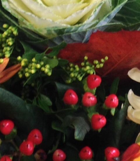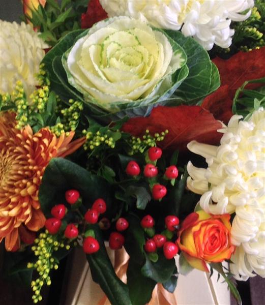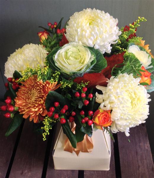 Large cream chrysanthemums are the focal point of this magnificent bouquet. Together they combine with roses, hypericum berries and solidater to create a classic gift.