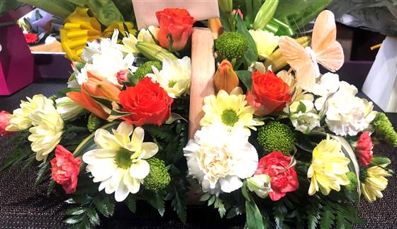 A gorgeous basket arrangement filled with shades of lemon and orange, to give a bright zesty feel