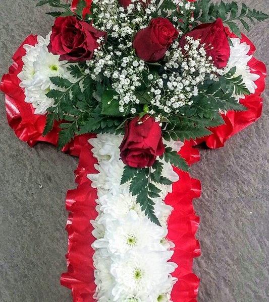 A base of white flowers with red ribbon and co ordinating ribbon colour - sizes available are 2',3'4' and 5' - show shown is 3'