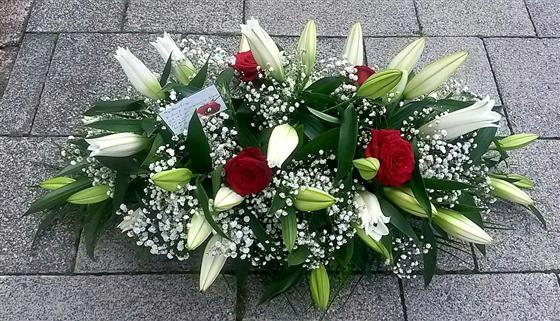 Stunning spray full of lilies and red roses, size shown is 2', other sizes available