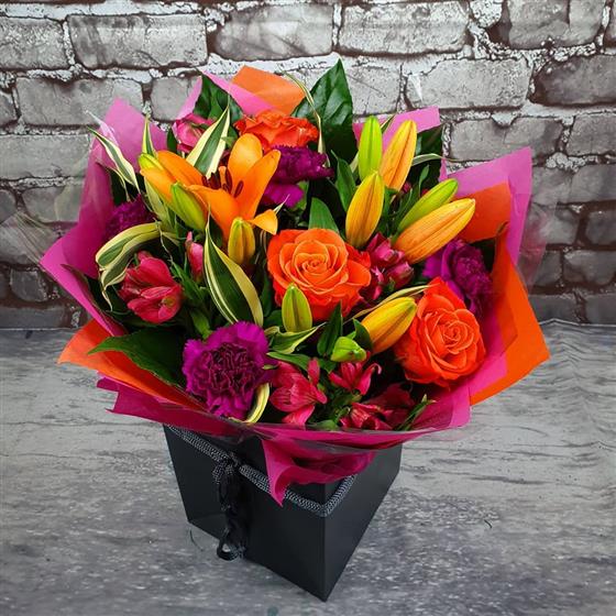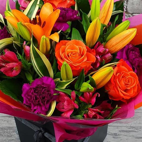 A bold Christmas arrangement bursting with warm seasonal colours, bright roses and lilies, and rich textures for a lively festive feel. Arranged using fresh flowers and natural style for a vibrant holiday gift.