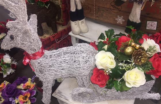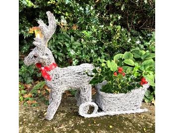 Beautiful grey reindeer pulling his sleigh, suitable for indoor or outdoor use, price includes sleigh filled with artificial flowers or seasonal plants - size is 52cm