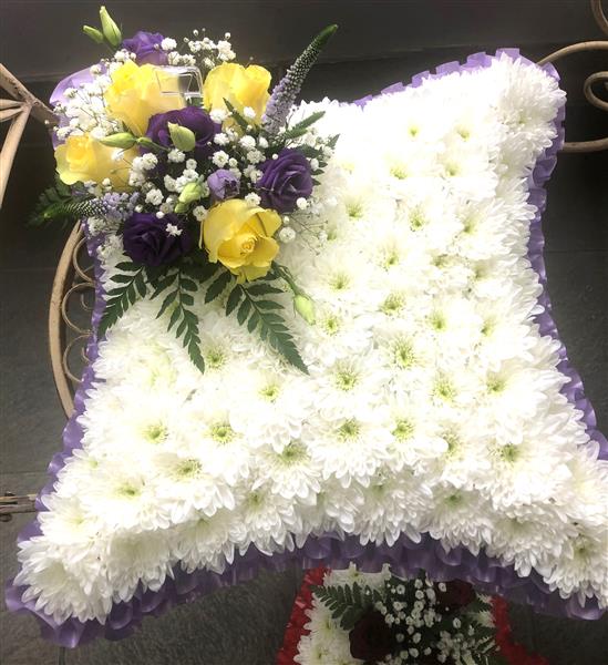 A lovely cushion with a purple ribbon edge and trimmed with a yellow rose spray, size shown is a medium