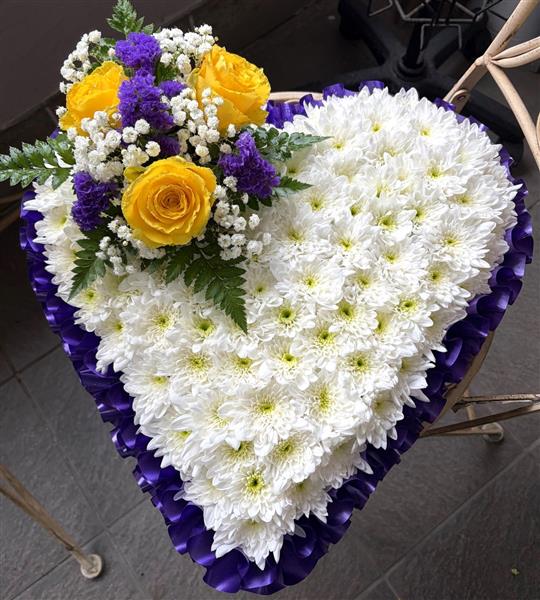 A lovely tribute for someone special who loved brighter colours, a deep purple edge with a spray of complementary yellow roses, overall size is 17"