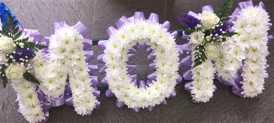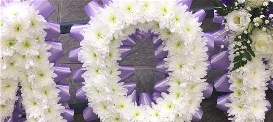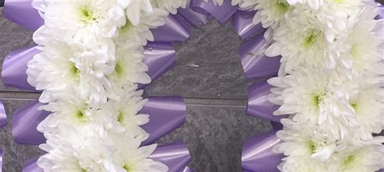 A base of white flowers, with a soft lilac ribbon and coordinated sprays with white roses and purples