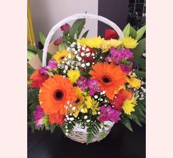 A stunning basket arrangement, filled with chrysanthemums, hot pink carnations, freesias, Alstros and orange and yellow gerberas