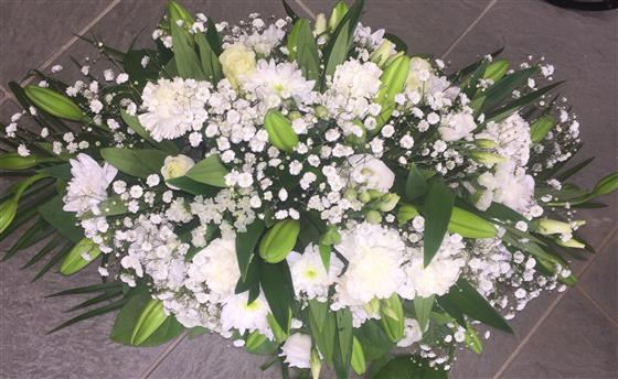 A classic and elegant double sided spray, filled with white roses, white daises, lilies, lysthanums, carnations gyp and lots of green foliage