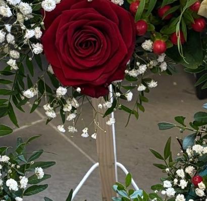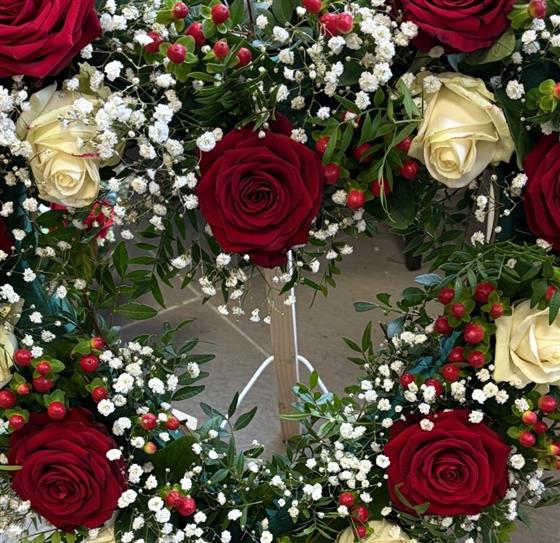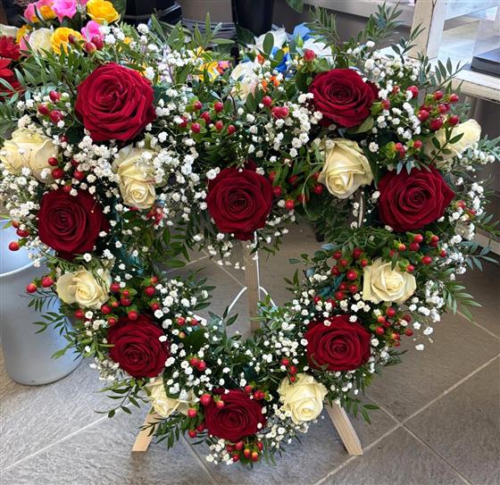 A beautiful selection of red and white roses, dark green foliage, red hypericum - all made to sit on a freestanding frame