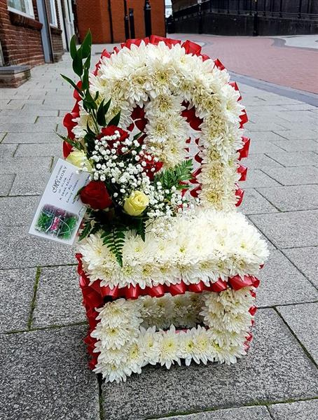 A beautiful tribute for someone special this chair in white flowers with red flowers used as accessories, size is 24" x 12" approximately