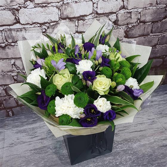 A beautiful Christmas arrangement filled with soft winter whites, rich purples and fresh green tones, arranged with a calm festive style. A peaceful and elegant design perfect for celebrating the season.